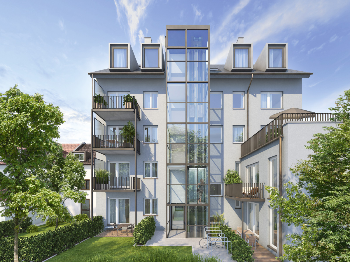 - Aufzugsanlage: An der Hoffassade wird – gemäß Baugenehmigung - ein zeitgemäßer Außenaufzug in Stahl-Glas Konstruktion vom EG (erreichbar vom Innenhof aus) bis auf die Zwischenebene 3.OG zu 4.OG angebaut und an das Treppenhaus angebunden. Lage, Größe und Details der Ausführung des Personenaufzugs können sich aufgrund von Auflagen der Baubehörde oder nach Abwägung durch die bauleitenden Architekten verändern.